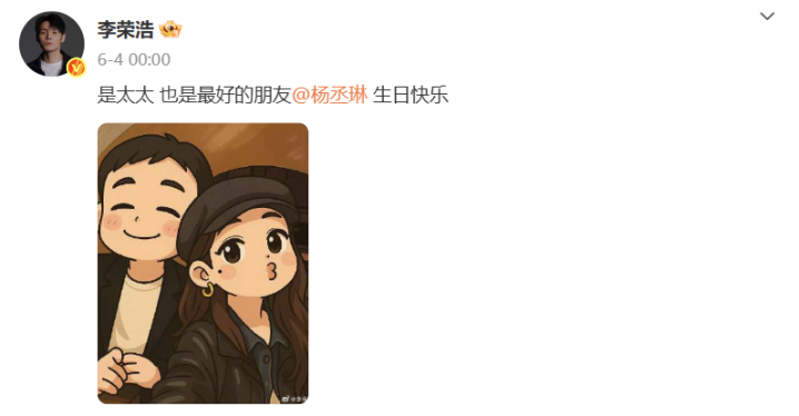 7月11日零点整,杨丞琳准时在社交平台发文为李荣浩庆生:"我喜欢我说我们这两个字,代表我和李荣浩,在一起的第11个生日快乐。"简单的一句话却藏着满满的深情。